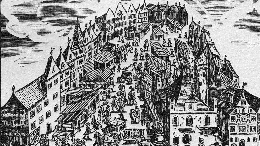 „Die Kaufleute stammten überwiegend aus Nürnberg, Antwerpen, Bergen, Valenciennes und Brüssel. Die seitdem regelmäßigen Versammlungen, die auf dem Platz vor dem Römer stattfanden, wurden 1605 erstmals ‚Börse‘ genannt.“