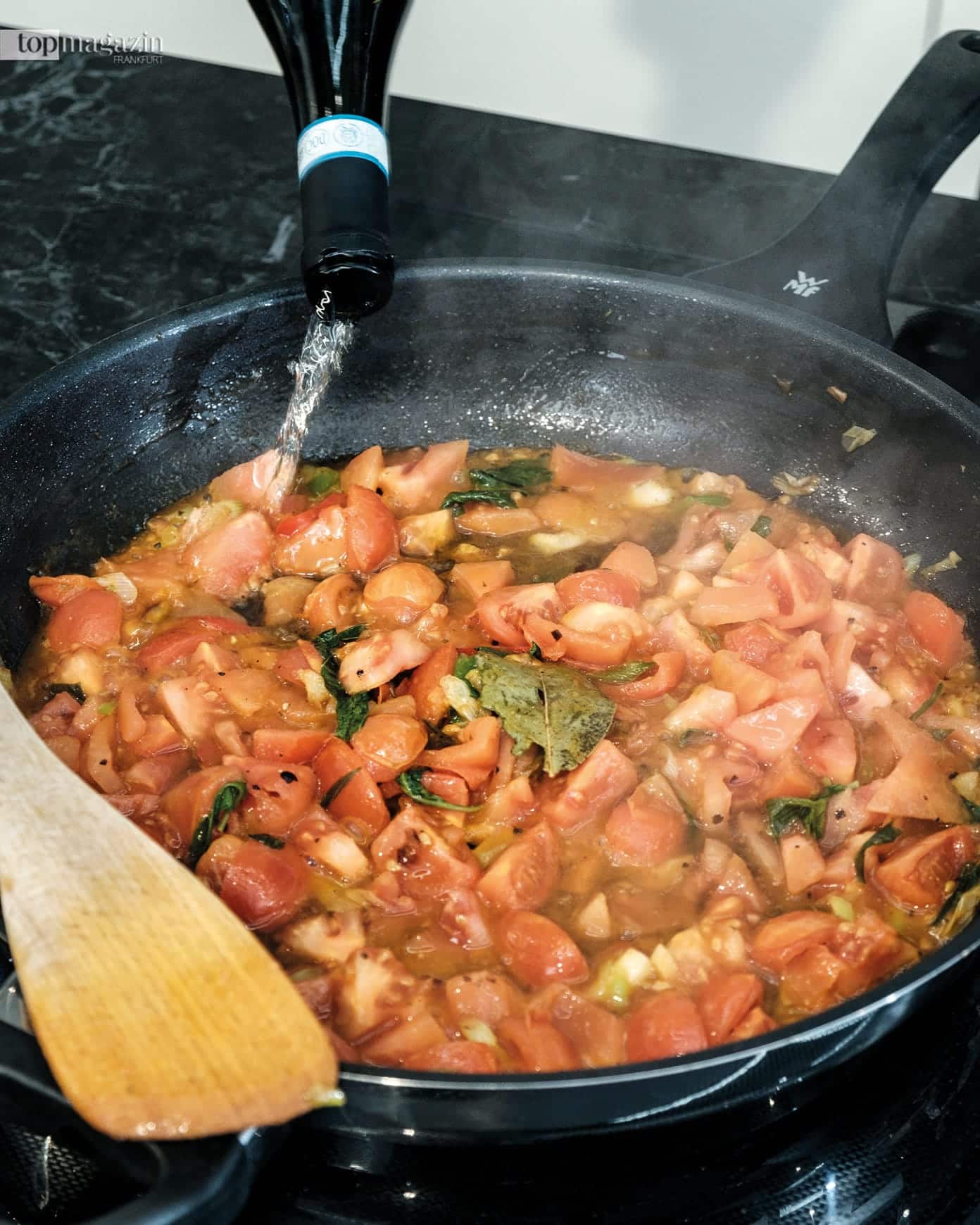 Er greift jetzt selbst zur Pfanne und gießt mit leichtem Schwung etwas Olivenöl hinein. Die zurechtgeschnittenen Tomaten, Lauchzwiebeln, Knoblauchzehen und Kräuter werden aufgekocht. Allmählich entwickelt sich ein kräftiger Sud. Grundsätzlich sei er nicht auf italienische Speisen festgelegt, fährt er fort. „Alle Geschmacksrichtungen sind ja in Frankfurt vertreten.