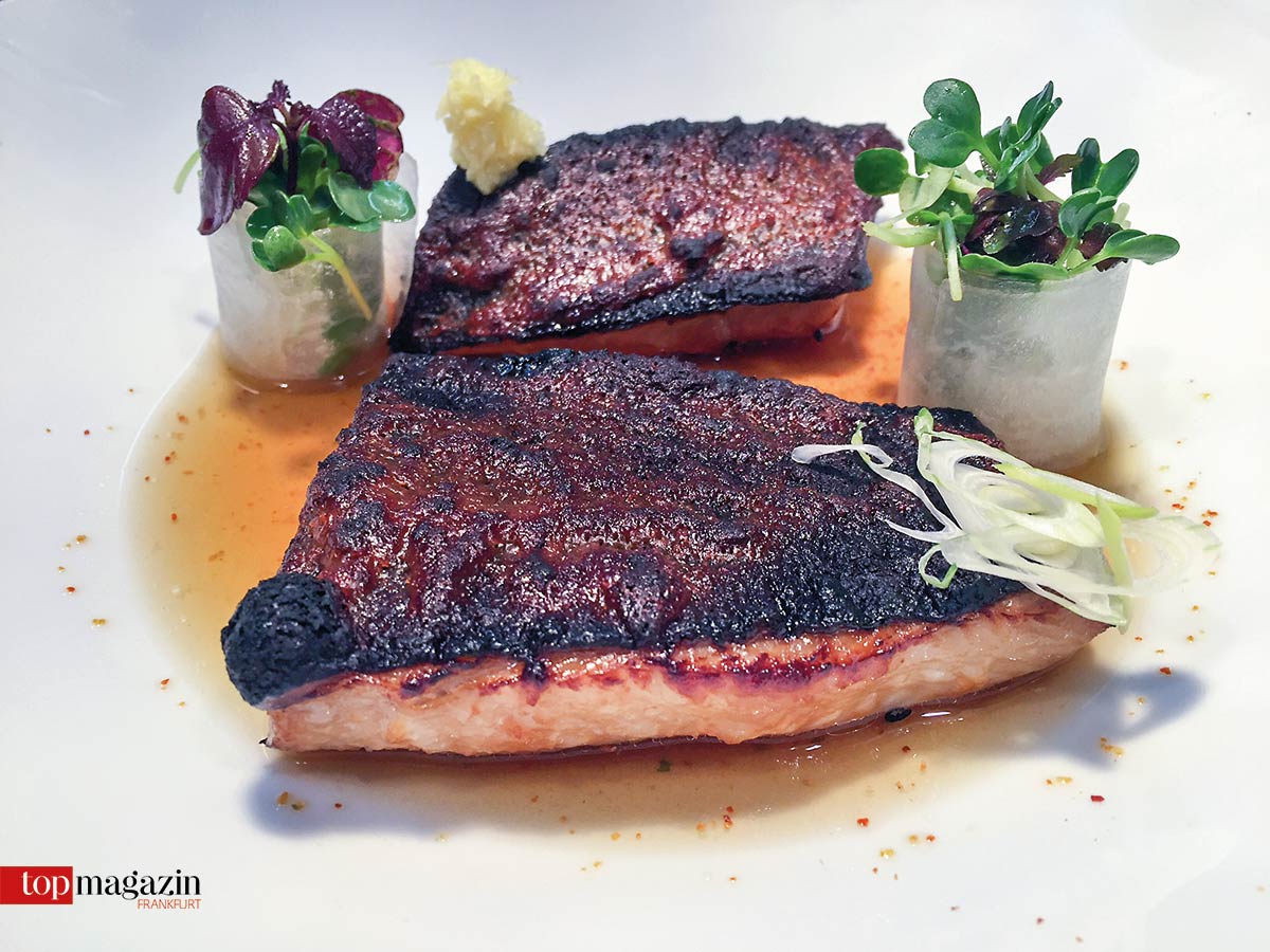 Der Black Cod hat eine ziemlich schwarze Haut, wobei sein Fleisch Perlmuttfarben ist. Der Fisch schmeckt komplex, ist aber recht einfach zuzubereiten. Dennoch gelingen nur wenigen Köchen herausragende Gerichte damit. Mario Lohninger vom gleichnamigen Restaurant in Frankfurt zählt dazu. Er mariniert ihn mit Miso, Sake und Mirin-Süßwein und serviert ihn in geräucherter Consommé nebst Rettich-Canneloni und Süßkartoffel.