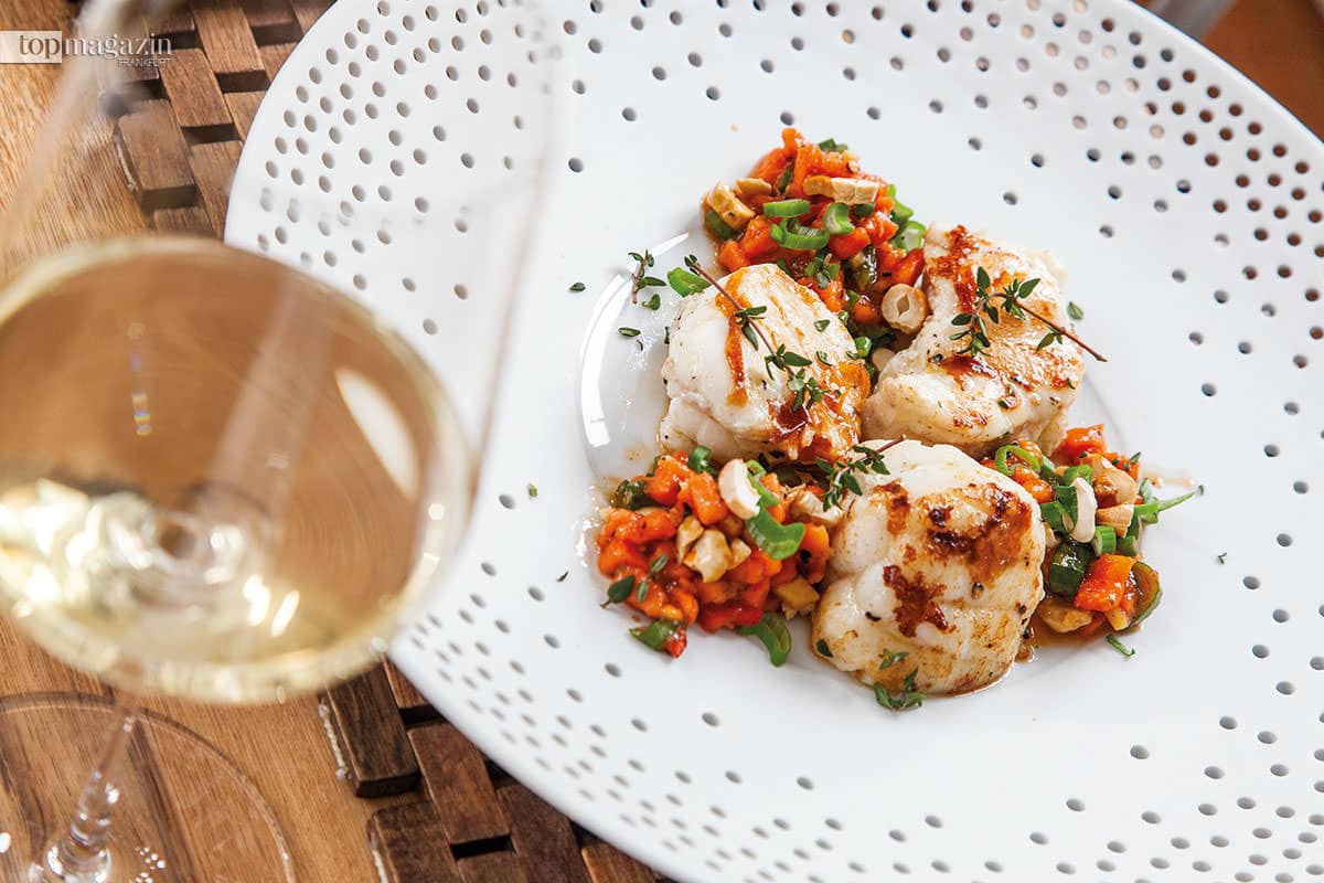 Während die Salsa durchzieht, um ihr volles Aroma zu entfalten, brät Thomas Anders jetzt die Seeteufel-Medaillons an. Zusammen mit Thymian- und Rosmarinzweigen sowie Knoblauch schmurgelt der Fisch in der Pfanne und verbreitet einen würzigen, intensiven Duft im Raum, der uns das Wasser im Mund zusammenlaufen lässt. Gut, dass schon kurze Zeit später der Tisch gedeckt werden kann und Seeteufel samt Papaya-Salsa auf unseren Tellern landen.