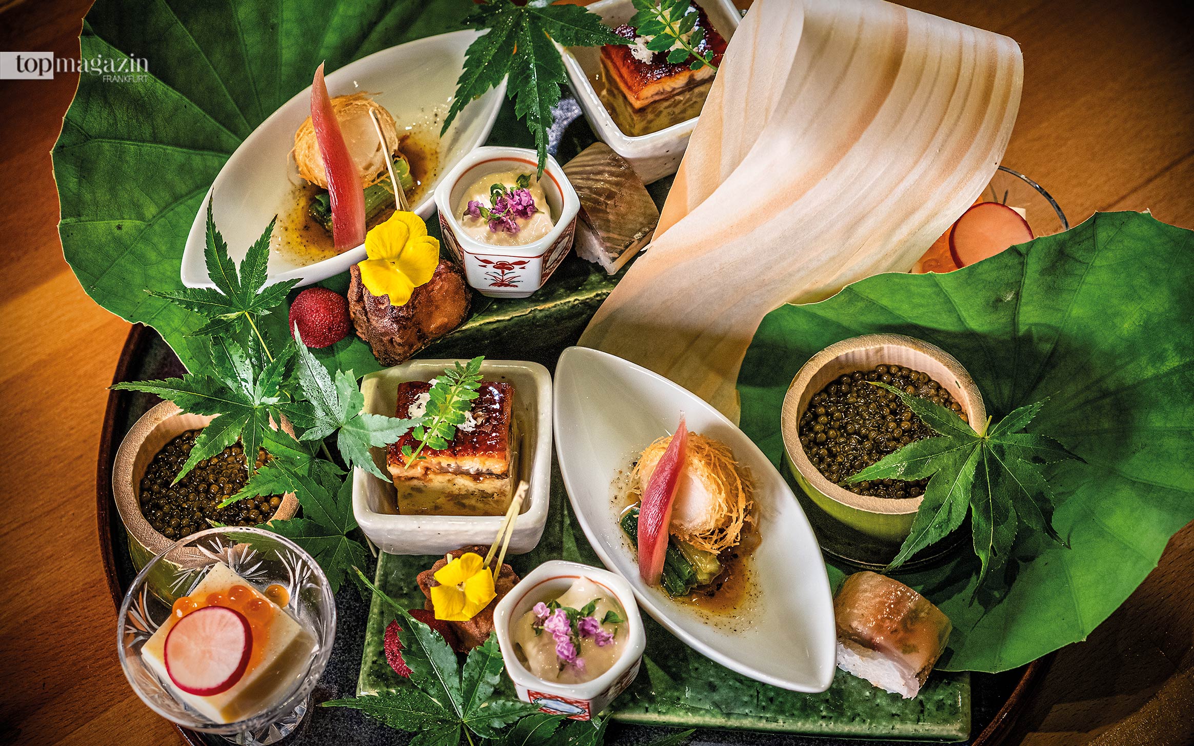 Masa steht für traditionelle japanische Haute Cuisine mit europäischen Einflüssen. „Ich habe mir ein tiefes Verständnis für europäische Geschmacksvorlieben aneignen können: Die Garnele gare ich bei niedrigeren Temperaturen, damit sie nicht zu trocken schmeckt. Statt Rapsöl verwende ich viel Traubenkernöl.“ Ein besonderes Souvenir hat Masaru Oae aus Düsseldorf mitgebracht: die Wasabi-Butter-Sauce nach original Nagaya-Rezept, die so fein schmeckt, dass man sie pur löffeln könnte. Er lächelt: „Für die man jetzt nur noch ins Frankfurter Ostend fahren muss!“