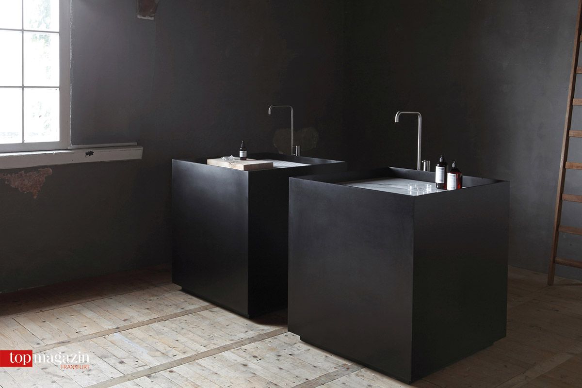 Der Acrylstein Hi-Macs ist dank seiner vielseitigen Einsetzbarkeit im Wellness-Bereich gerne gesehen. Der Werkstoff ist porenfrei und stoßfest. Badelemente wie Wannen und Ablageflächen erscheinen wie aus einem Guss. Das dänische Label Notonlywhite bietet mit seiner Kollektion Scape schwarze freistehende Maxi-Waschbecken mit verschiedenen weißen Einsätzen.