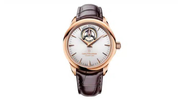 Beim Wort Tourbillon schlagen die Herzen von Uhrenliebhabern höher. Bei der Manero Tourbillon Double Peripheral von Carl F. Bucherer in 18 Karat Rotgold mit Alligatorleder-Armband ist es weder in der Grundplatine des Uhrwerks noch in einer darüber liegenden Brücke gelagert und scheint regelrecht in der Uhr zu schweben.