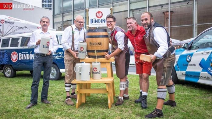 Gestern konnte das eigens für die Wiesn-Gaudi gebraute Binding-Bier schon einmal gekostet werden. Und das diesmal direkt an der Quelle, nämlich vor dem Sudhaus der Binding Brauerei. Nachdem die Verkostung im letzten Jahr auf dem Schiff und zuvor auf dem Römer stattfand, hieß es in diesem Jahr: Back to the roots! „Wir stehen hier direkt vor unseren Braukesseln, es kann keine bessere Kulisse geben“, betonte Binding-Vorstand Otto Völker.