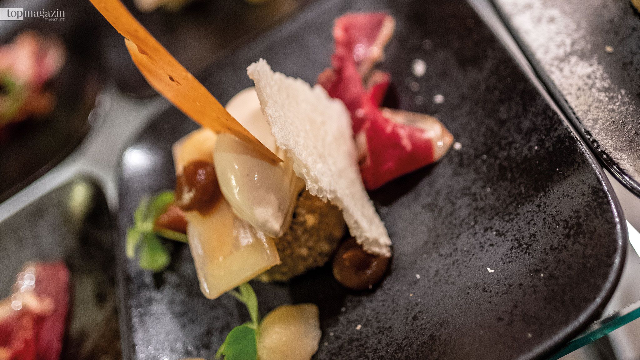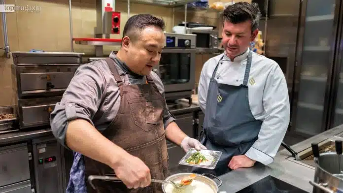 So wurden an den Live-Cooking- Stationen vorwiegend asiatisch geprägte Kreationen wie Jakobsmuscheln an fermentierten Bohnen und Shitake serviert – für einen sündhaft süßen Abschluss sorgte dann Arne Müller mit raffinierter Pâtisserie.