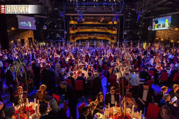 Nach den Darbietungen des Ensembles von Generalmusikdirektor Sebastian Weigle war es dann wieder soweit: Die Große Bühne drehte sich und gab den Blick auf die prächtig gedeckten Tafeln frei, an denen dem Musikgenuss die kulinarischen Freuden folgten. Grund zur Freude hat im Übrigen auch Organisatorin Katherine Fürstenberg-Raettig: Der Vorverkauf für die 16. Operngala 2014 läuft bereits. Dann heißt es, wie Intendant Bernd Loebe munter proklamierte, „die Million zu knacken.“