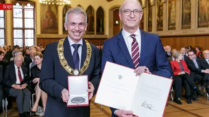 „Voll die Ehre, wie es in der Jugendsprache heißt“, lachte Prof. Dr. Roland Kaehlbrandt, nachdem ihm im Kaisersaal als Vorstandsvorsitzender der Stiftung Polytechnische Gesellschaft Frankfurt von Oberbürgermeister Peter Feldmann die Ehrenplakette der Stadt Frankfurt überreicht worden war.