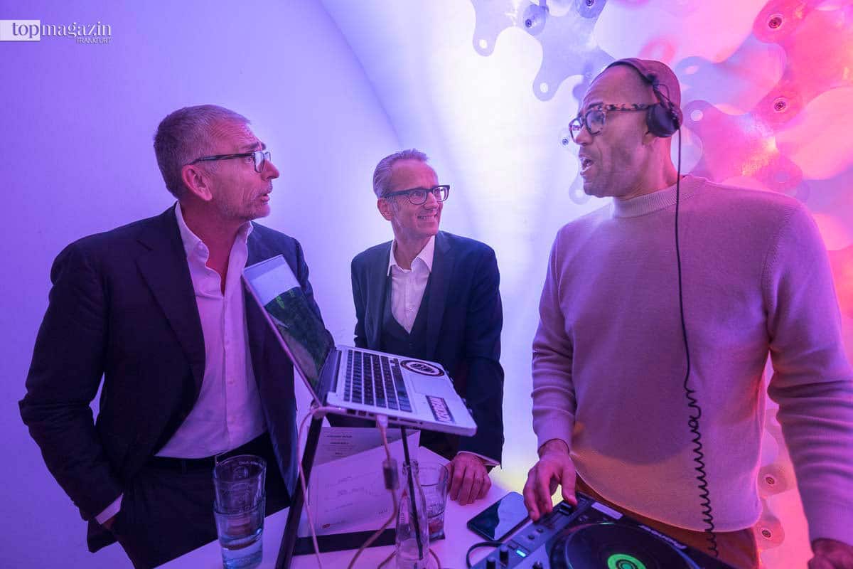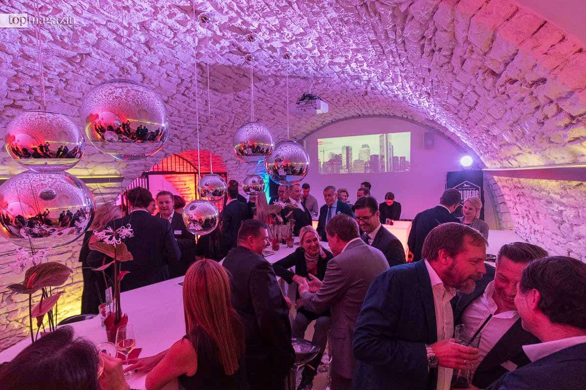 Mindestens ebenso beliebt wie die Beletage war auch der Gewölbekeller, und das auch noch zu späterer Stunde. Schauten einige Gäste, darunter Mediengruppe Frankfurt-Chef Oliver Rohloff und Immobilienmakler Rainer M. Ballwanz, dem Frankfurter DJ Julian Smith beim Auflegen satter Klänge über die Schulter, bot einige Meter weiter die „TnT Gin Bar“ eigens kreierte Cocktails, die beim entspannten Netzwerken genossen werden konnten.