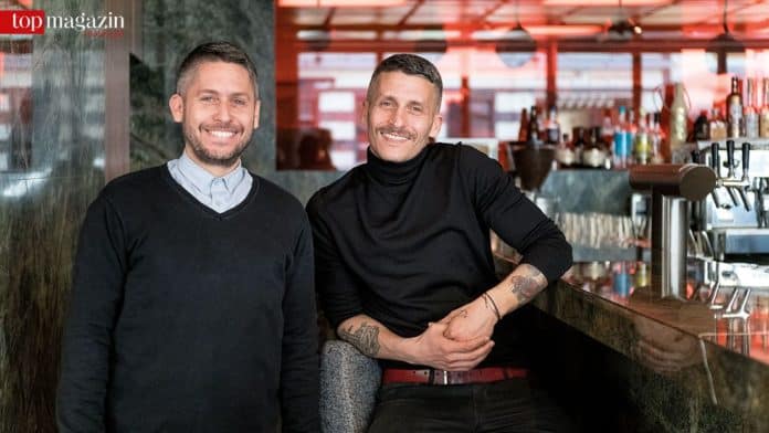Das Restaurant überrascht mit einer Mischung aus Eleganz und Bodenständigkeit. Wände und Bar sind mit Marmor verkleidet, der Boden ist ein einfacher Estrich. Klassische Symmetrie dominiert. Auf den Tischen liegen weiße Tischdecken. Doch die strenge Ordnung sprengen die Gäste. Einige erscheinen im Business Qutfit, andere in Sportklamotten. „Bei uns gibt es keinen Dresscode“, erzählt David, 41, der Jüngere. „Jeder kann kommen, wie er will.“