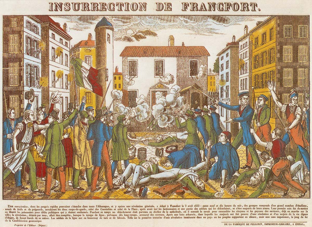 Sie weiß auch, was der Frankfurter Wachensturm ein Jahr später mit Pornografie zu tun hat. Burschenschaftler aus Heidelberg und Mannheim sowie Offiziere stürmten am 3. April 1833 Hauptwache und Konstablerwache. Doch ihr Plan – mit den dort verwahrten Waffen die Gesandten der deutschen Fürsten, die im Palais Thurn und Taxis respektive im Bundestag des Deutschen Bundes tagten, gefangen zu nehmen – ging nicht auf. Was als Signal zu einer nationalen und demokratischen Erhebung in ganz Deutschland gedacht war, forderte etliche Tote.