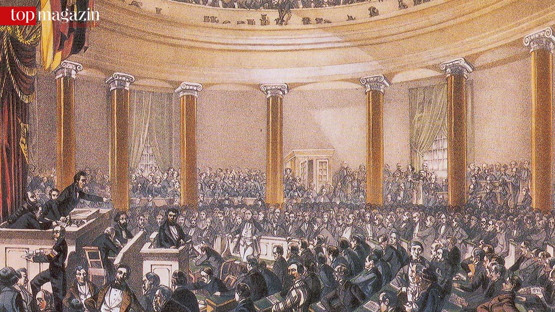 Was wäre, wenn aus dem deutschen Frühling von 1848, aus dem Paulskirchenplenum, tatsächlich eine gesamtdeutsche Demokratie hervorgegangen wäre? Knifflige Frage. Dabei fing alles so erfolgsversprechend an. Die geistige Elite kam zusammen, Rhetorik stand hoch im Kurs. Erstmals schlossen sich politische Aktivisten zu Fraktionen zusammen, monatelang tagte man in Gaststuben. Wo besser hätte man bei Wein und kämpferischen Liedern debattieren können? Im Café Milani am Roßmarkt trafen sich jene, die sich für die Wahrung der Vorrechte der Einzelstaaten und der Monarchen stark machten, sie saßen in der Paulskirche rechts außen.