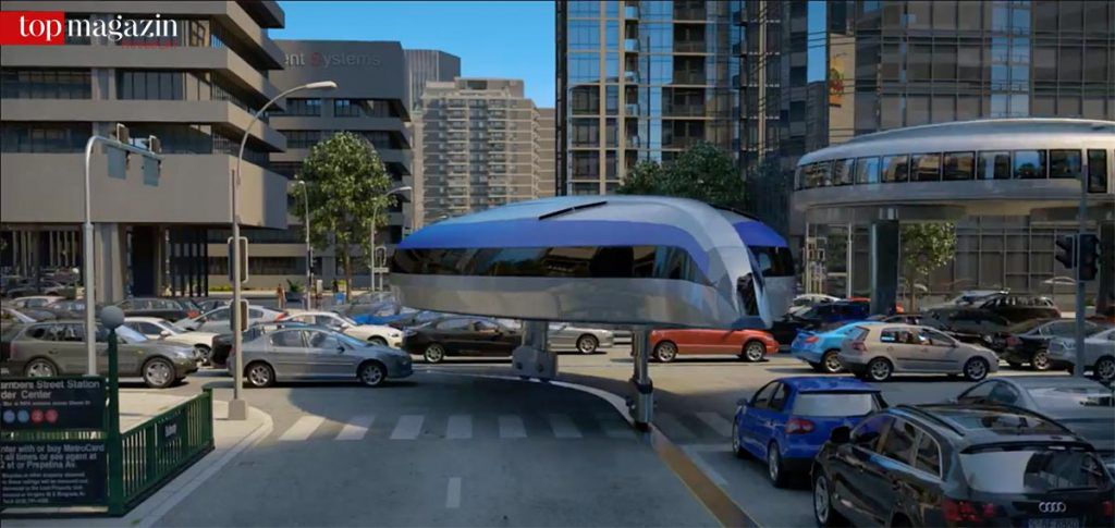 Als Personenbus genutzt, fügt sich das von Semenov „Transit Elevated Bus“ benannte Gefährt nahtlos in den Großstadtverkehr ein.
